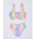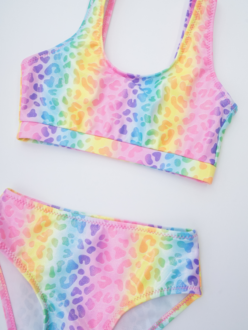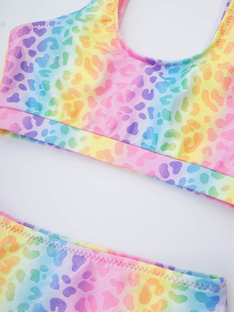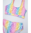 Costumul este confecționat dintr-o stofă strălucitoare, care nu doar că arată fantastic, dar este și rezistentă la apă, asigurând confortul în apă. Top cu bretele late, care se adaptează perfect corpului fetiței, oferind suport și comfort. Slipul clasic se completează perfect cu topul, având un croi simplu și confortabil. Designul cu culorile curcubeului este realizat din diverse nuanțe strălucitoare, creând un efect vizual splendid.