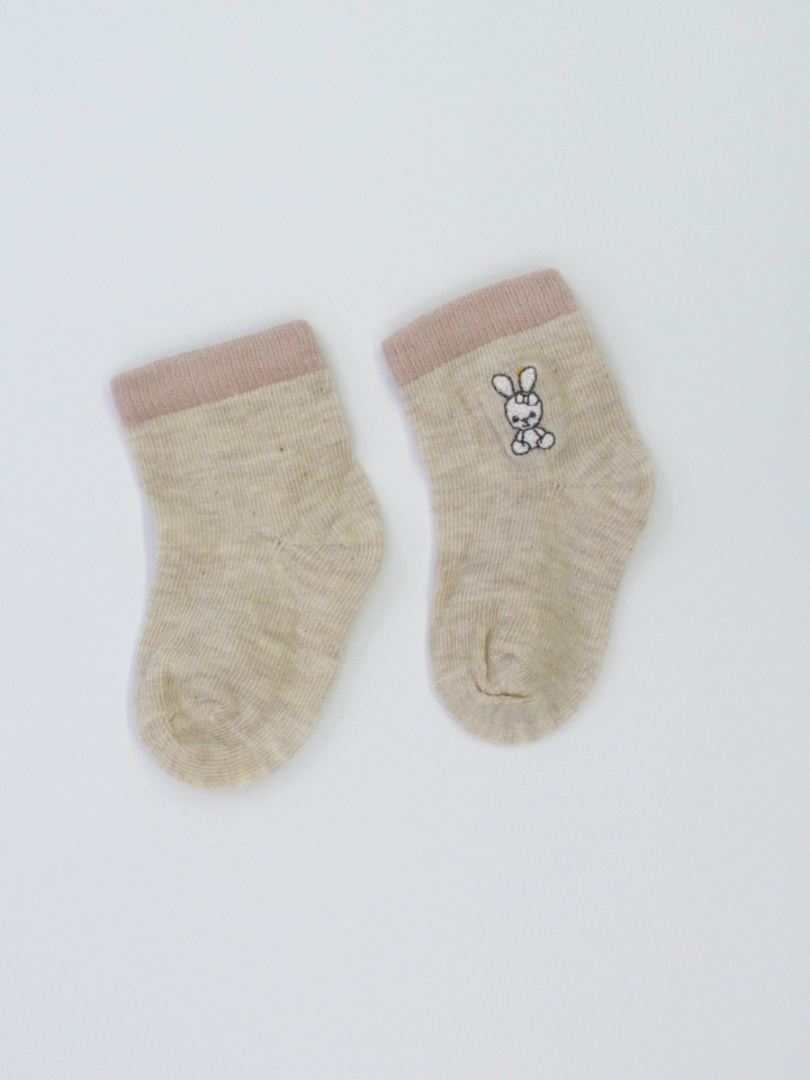 Нежный дизайн в светлых тонах дополнен очаровательной деталью: вышивкой с игривым зайчиком, которая добавляет весёлый и привлекательный штрих. Эластичная резинка на щиколотке нежного оттенка фиксирует носок, не сдавливая ножку малыша. Шов на пальцах отсутствует.