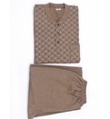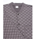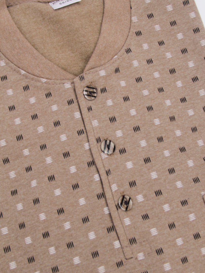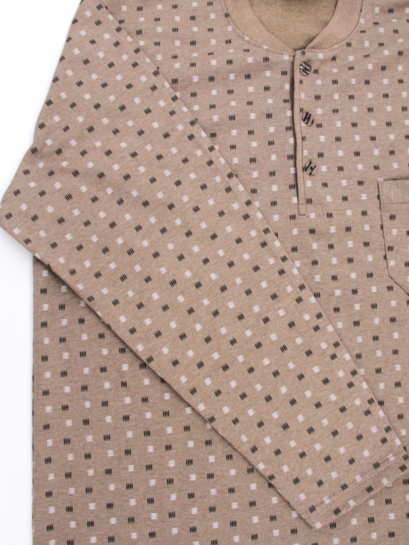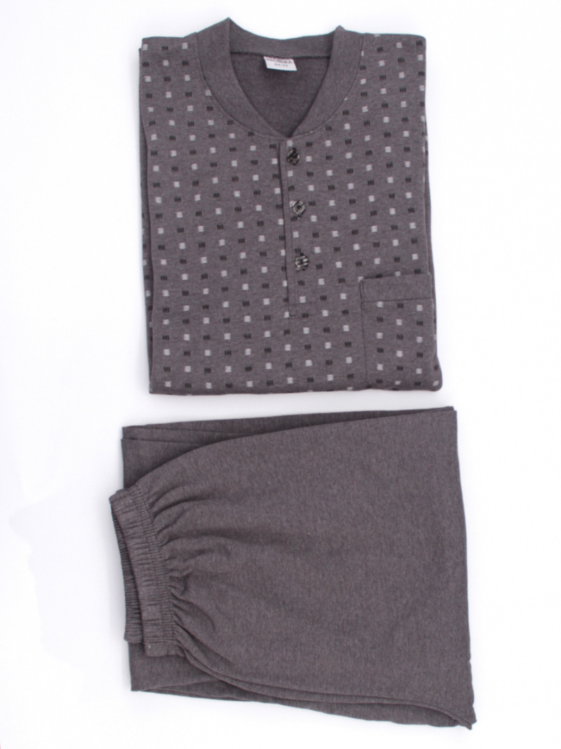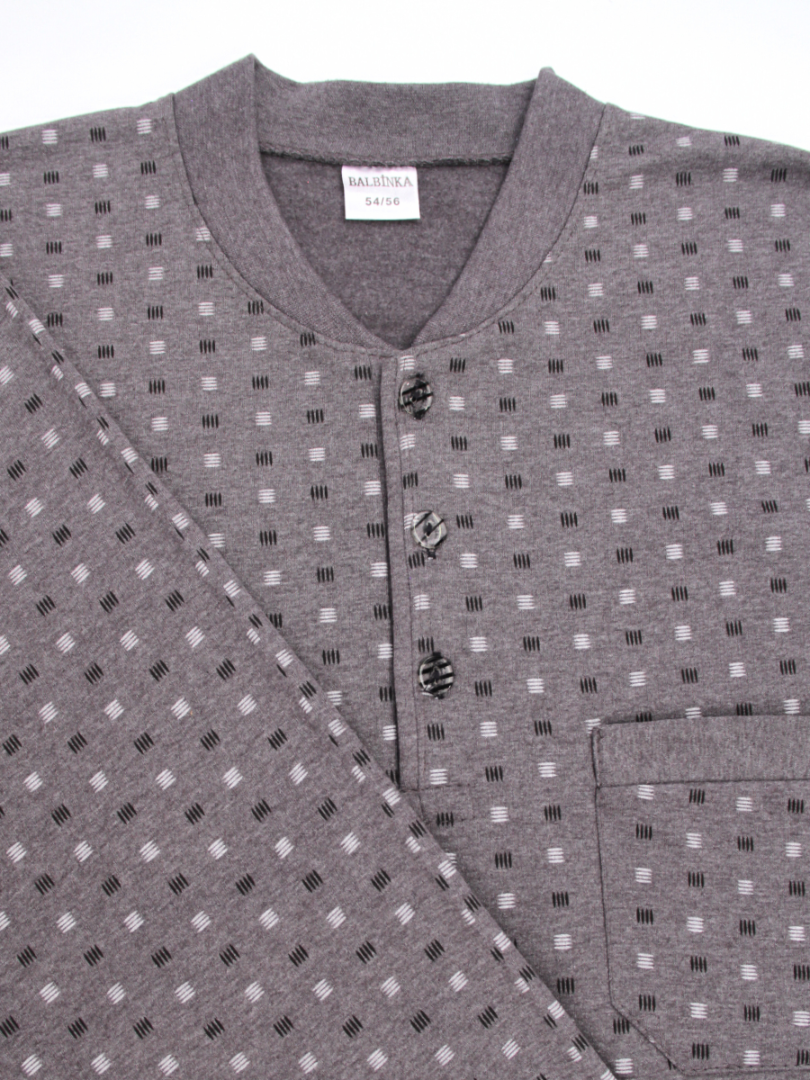 Блузка имеет классический крой, застегивается на пуговицы на горловине и имеет боковой карман, украшенный неброским геометрическим принтом. Брюки имеют эластичный пояс, удобно сидят и обеспечивают полную свободу движений. Эта теплая мужская пижама идеально подходит для дома, сна или отдыха, являясь прочным, долговечным изделием и подходит для осенне-зимнего сезона.