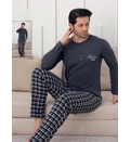 Выбирайте комфорт и стиль даже дома с этой хлопковой пижамой для мужчин. Комплект состоит из блузки с длинными рукавами, частичной застёжкой на пуговицы и неброским принтом на груди, а также длинных брюк с клетчатым принтом. Эта мужская пижама идеально подходит для холодного времени года, сочетая в себе элегантность и функциональность — отличный выбор для современного мужчины, ценящего комфорт и изысканность.
