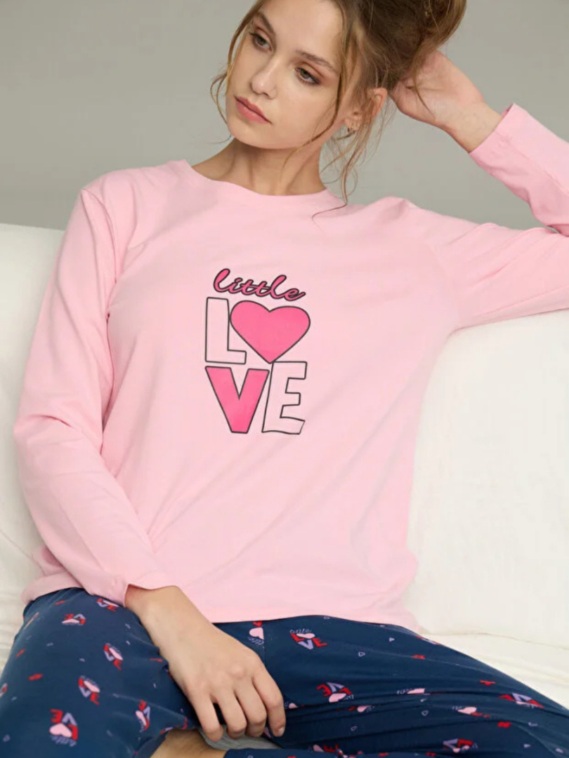Комплект состоит из блузки с длинными рукавами и длинных брюк. Свободный крой обеспечивает свободу движений, идеально подходит как для сна, так и для отдыха дома. Удобная и практичная, эта хлопковая пижама станет незаменимой вещью в вашем домашнем гардеробе, гарантируя комфорт и элегантный вид даже во время отдыха.