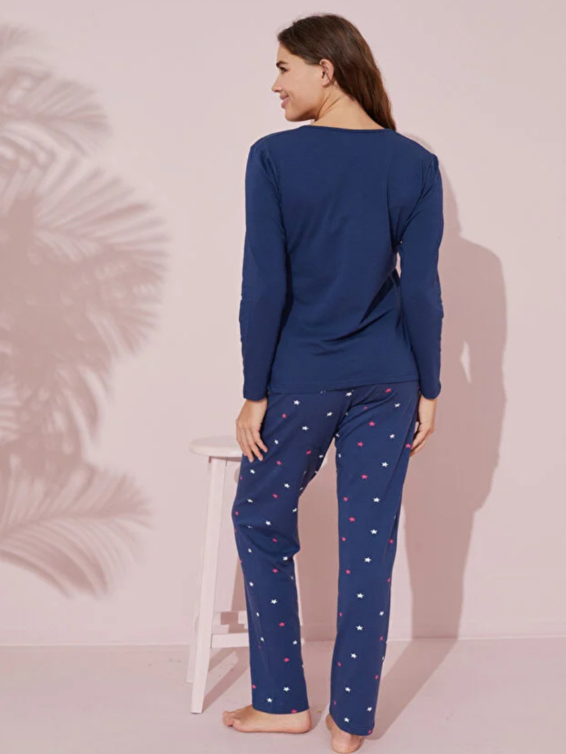 Комплект состоит из блузки с длинными рукавами и длинных брюк. Свободный крой обеспечивает свободу движений, идеально подходит как для сна, так и для отдыха дома. Удобная и практичная, эта хлопковая пижама станет незаменимой вещью в вашем домашнем гардеробе, гарантируя комфорт и элегантный вид даже во время отдыха.