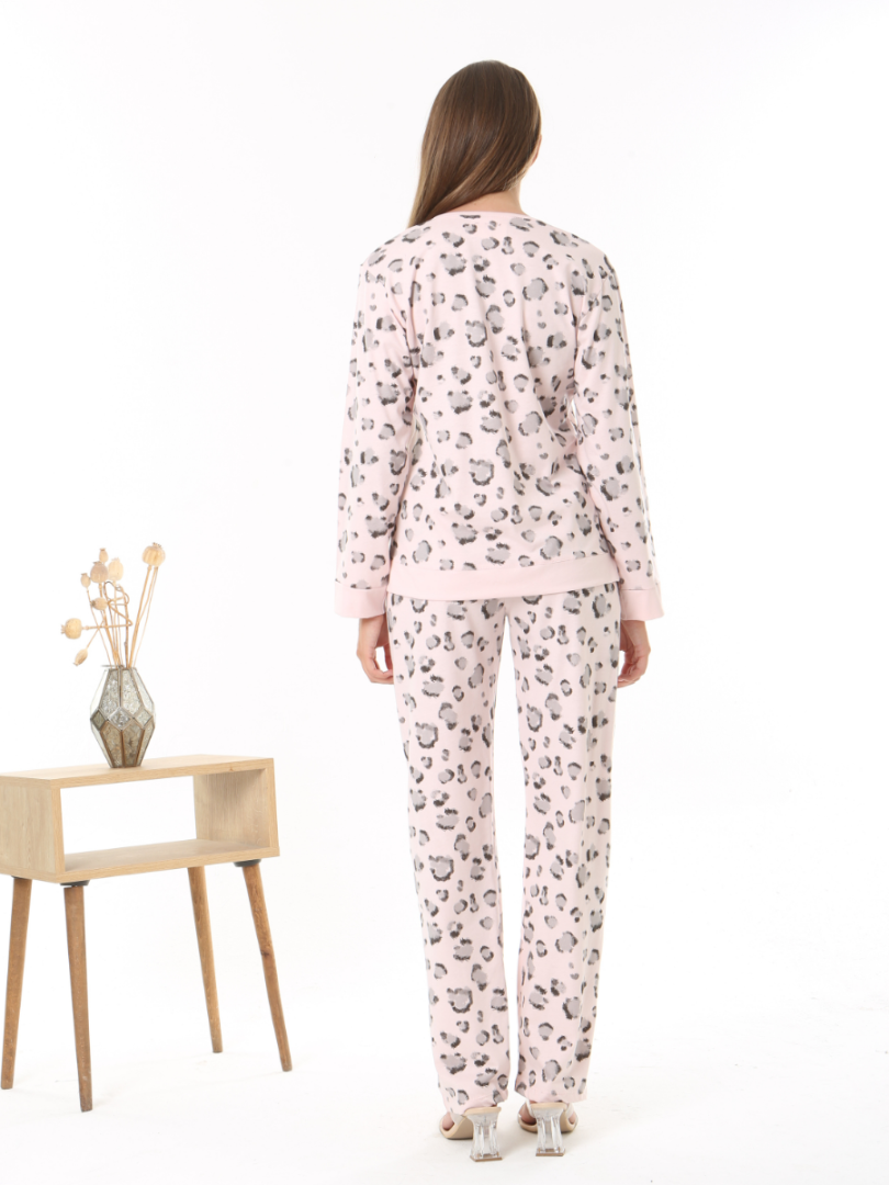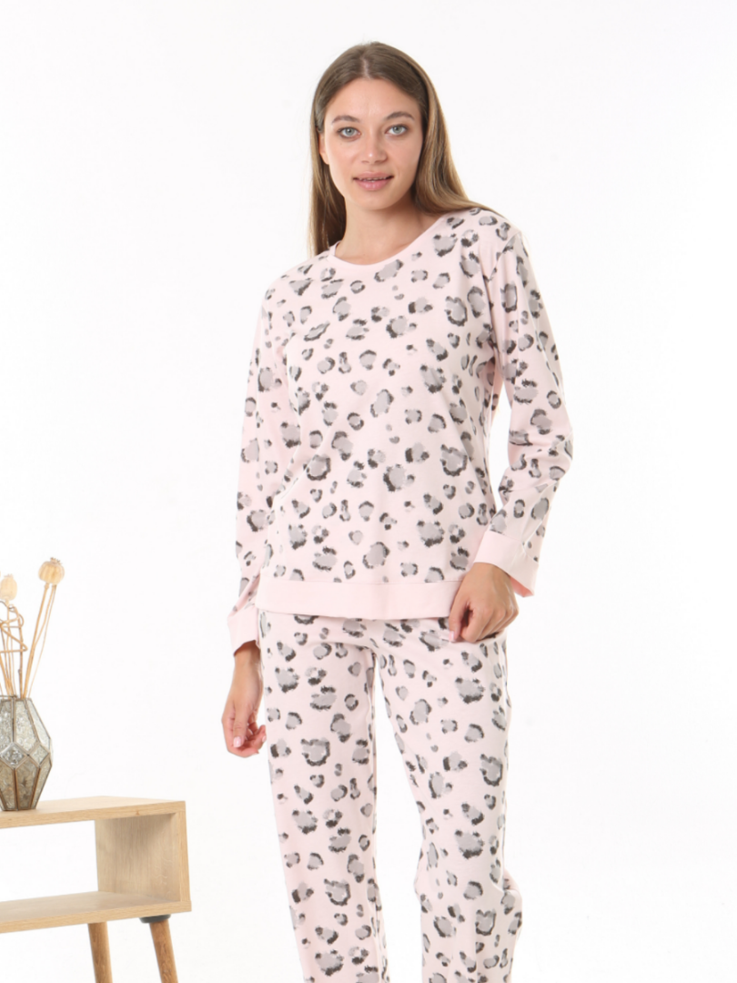 Комплект состоит из блузки с длинными рукавами и длинных брюк. Оба изделия украшены современным анималистичным принтом на нежно-розовом фоне, что добавляет женственности и стиля. Свободный крой обеспечивает свободу движений, делая эту пижаму идеальной как для сна, так и для отдыха дома. Элегантная и практичная одновременно, эта хлопковая пижама станет незаменимой вещью в вашем домашнем гардеробе, гарантируя комфорт и элегантный вид даже во время отдыха.