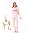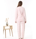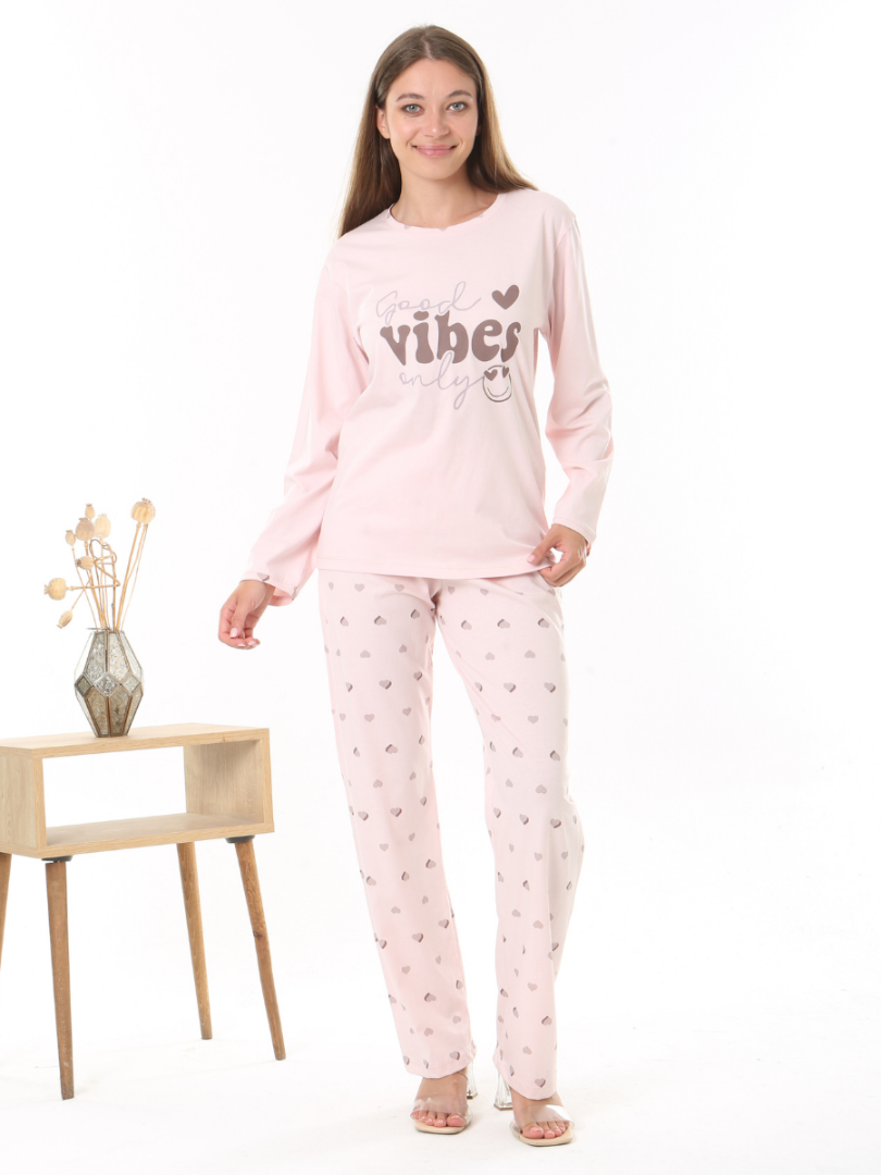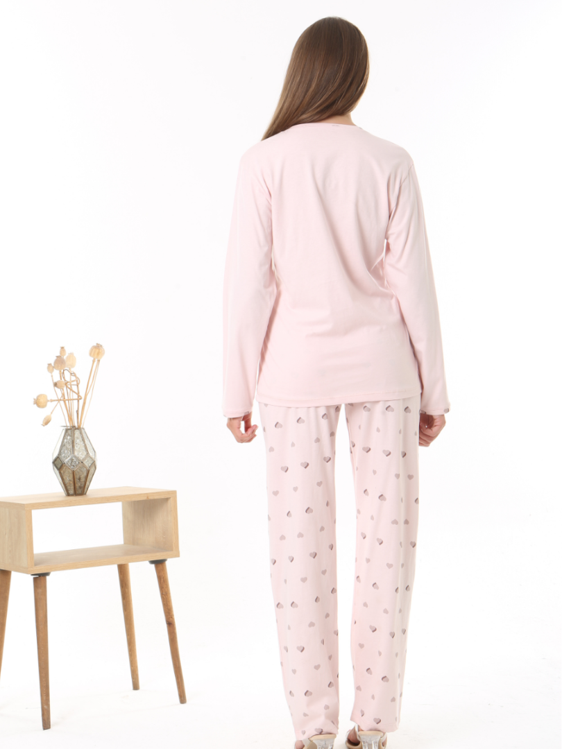В комплект входят блузка с длинными рукавами и длинные брюки, оба изделия украшены принтом в виде сердца на нежно-розовом фоне, что добавляет образу женственности и стиля. Свободный крой обеспечивает свободу движений, делая эту пижаму идеальной как для сна, так и для отдыха дома. Элегантная и практичная одновременно, эта хлопковая пижама станет незаменимой вещью в вашем домашнем гардеробе, гарантируя комфорт и элегантный вид даже во время отдыха.