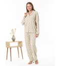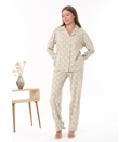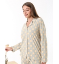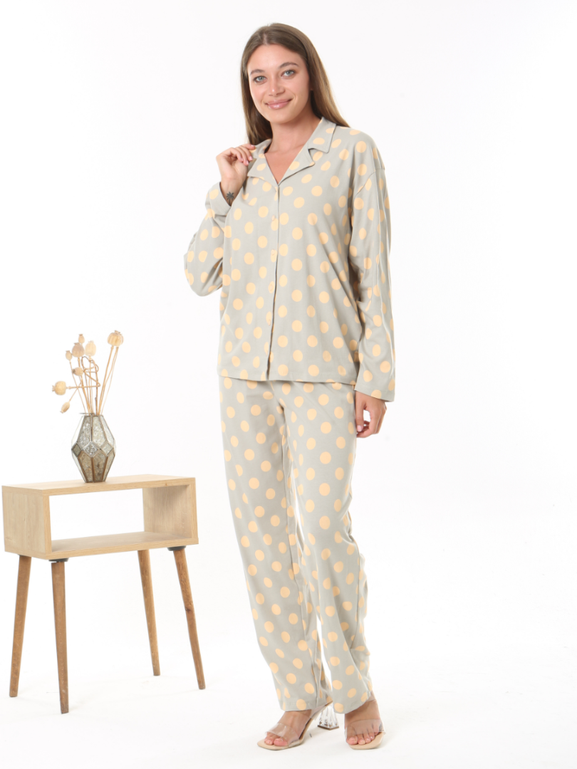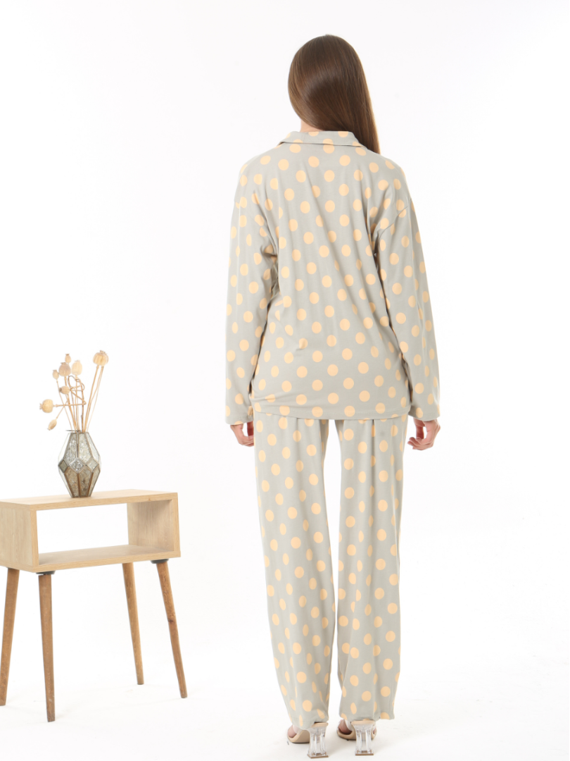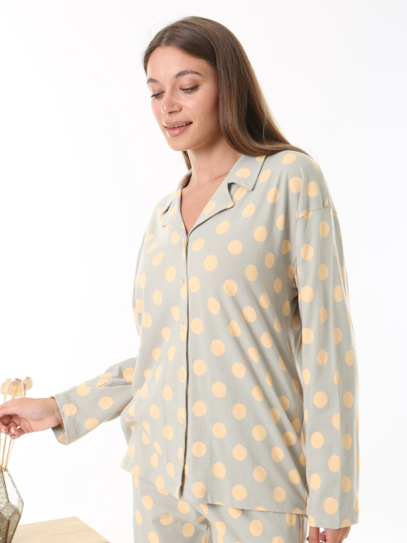 Свободный, слегка струящийся крой обеспечивает свободу движений и дополнительный комфорт, а классические лацканы и пуговицы спереди придают пижаме вневременную элегантность. Пуговицы на рубашке позволяют быстро расстегнуть пижаму для кормления без лишних усилий. Принт в горошек добавит нотку веселья в ваш вечерний образ. Прямые брюки с эластичной талией и регулируемым внутренним шнурком. Свободный крой — подходит для любого типа фигуры.