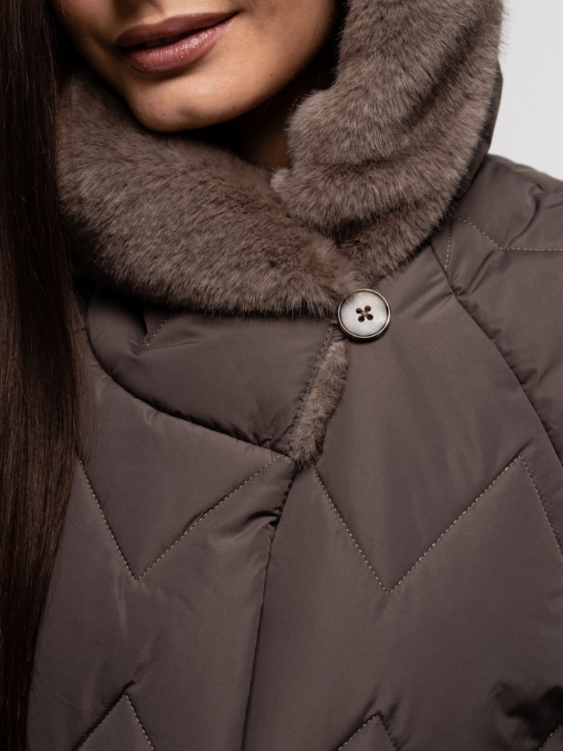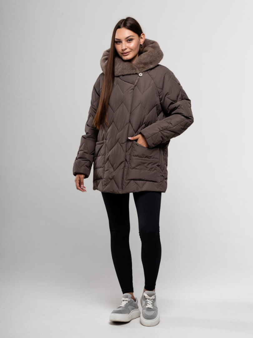 Куртка оснащена большим и уютным капюшоном, который надежно защитит от холода и ветра. Капюшон отделан пышным мехом, имитирующим искусственную норку. Этот элемент не только добавляет роскоши, но и обеспечивает дополнительное тепло в области шеи и головы. Глубокие боковые карманы позволяют согреть руки или хранить необходимые мелочи.