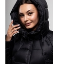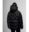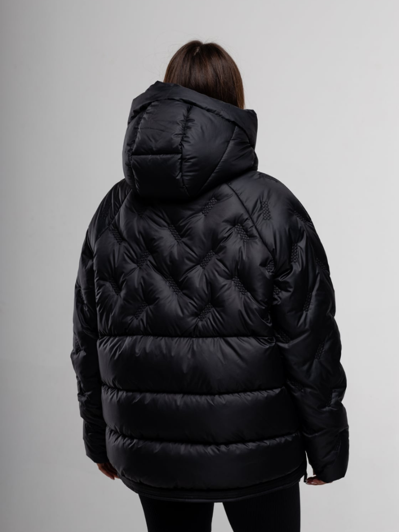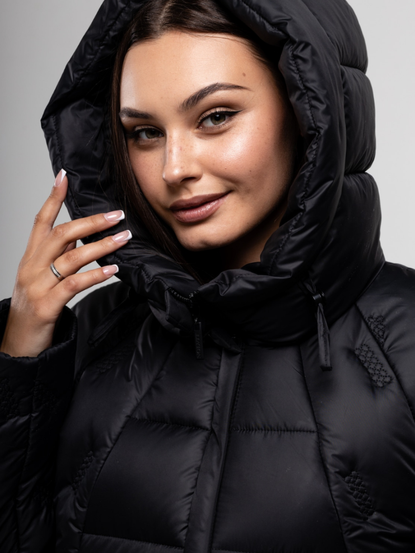 Дизайн куртки продуман до мелочей, сочетая в себе практичность и эстетику. Особое внимание привлекает декоративный стеганый узор, расположенный на задней части куртки и на рукавах, который придает изделию уникальный и современный вид. Этот элемент не только украшает куртку, но и способствует равномерному распределению наполнителя, предотвращая его сбивание и обеспечивая долговечность изделия. Капюшон, незаменимый атрибут зимней одежды, оснащен удобными кулисками для регулировки объема, что позволяет идеально подогнать его по форме головы и обеспечить дополнительную защиту от ветра и снега.