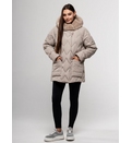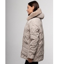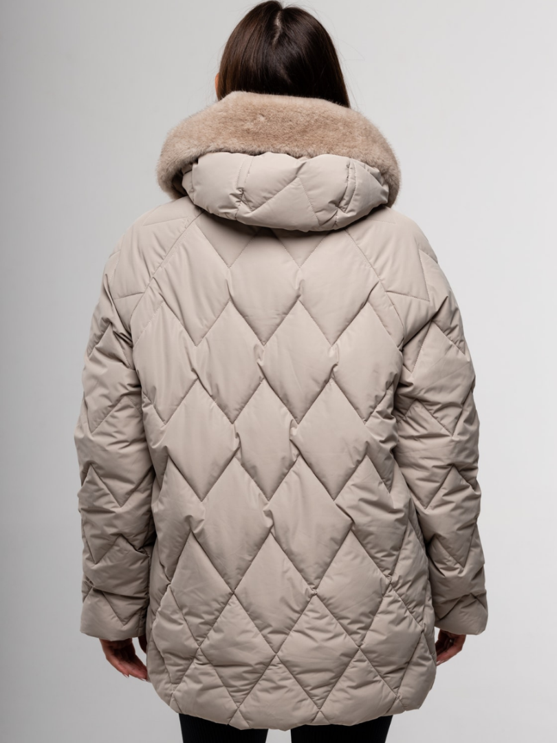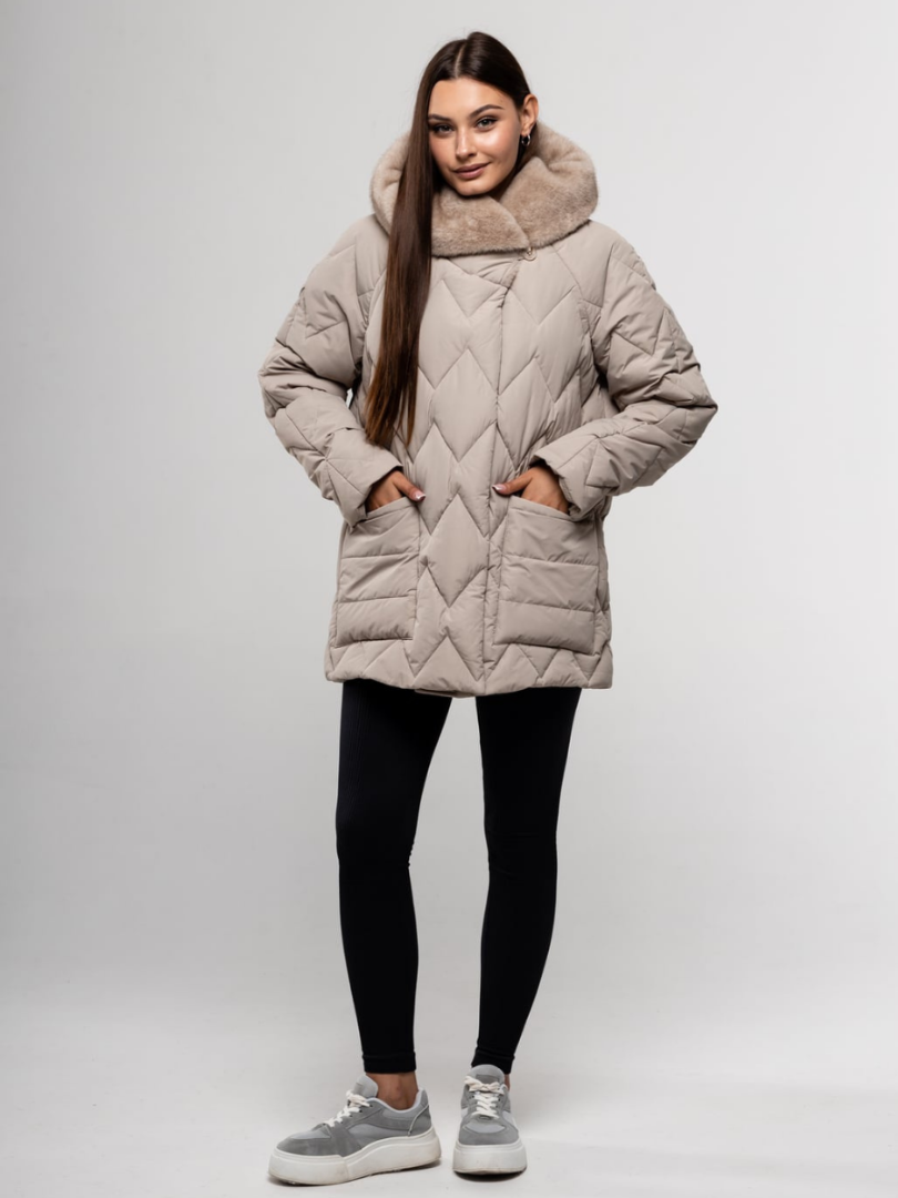 Куртка оснащена большим и уютным капюшоном, который надежно защитит от холода и ветра. Капюшон отделан пышным мехом, имитирующим искусственную норку. Этот элемент не только добавляет роскоши, но и обеспечивает дополнительное тепло в области шеи и головы. Глубокие боковые карманы позволяют согреть руки или хранить необходимые мелочи.