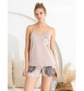 Setul este compus din maiou cu bretele subțiri și decolteu delicat decorat cu dantelă fină, care adaugă un plus de feminitate. Pantalonii scurți cu imprimeu modern au talie elastică confortabilă, oferind libertate de mișcare și confort pe durata întregii nopți.