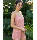 Designul feminin este completat de imprimeul discret cu inimioare, care oferă pijamalei un aspect delicat și romantic. Bretelele cu volănașe și croiala lejeră adaugă un plus de eleganță și rafinament.