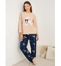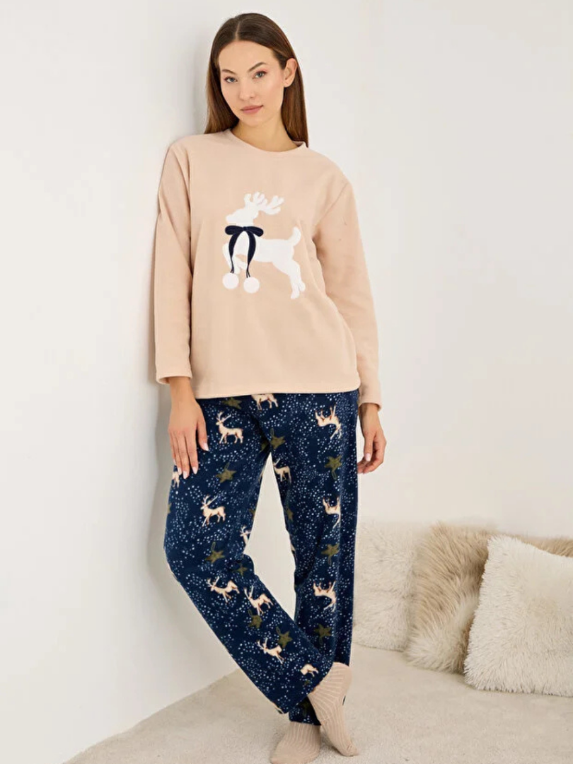 Pijama confecționată din fleece moale, compusă din bluză și pantaloni. Bluză cu decolteu rotund, cu mâneci lungi. Pantaloni drepți cu elastic în talie.