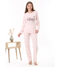 Setul include bluză cu mânecă lungă și pantaloni lungi, ambele decorate cu imprimeu cu inimioare pe fond roz pal, adăugând un strop de feminitate și stil. Croiala lejeră asigură libertate de mișcare, fiind ideală atât pentru somn, cât și pentru relaxarea de acasă. Elegantă și practică în același timp, această pijama din bumbac este un must-have în garderoba de homewear, garantând confort și un aspect chic chiar și în momentele de odihnă.