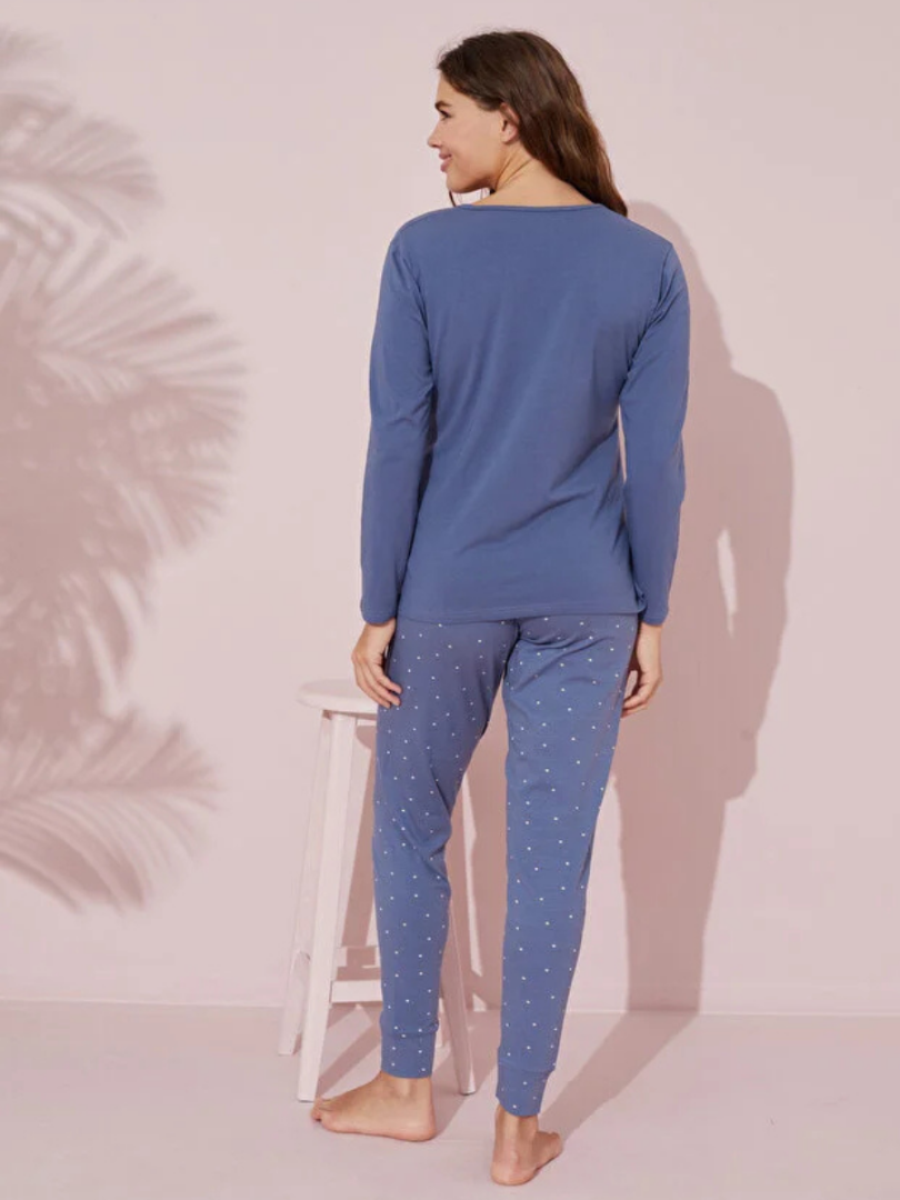 Setul include bluză cu mâneci lungi și decolteu rotund și pantaloni lungi cu manșete. Croiala lejeră asigură libertate de mișcare, fiind ideală atât pentru somn, cât și pentru relaxarea de acasă. Comodă și practică în același timp, această pijama din bumbac este un must-have în garderoba de homewear, garantând confort și un aspect chic chiar și în momentele de odihnă.