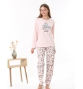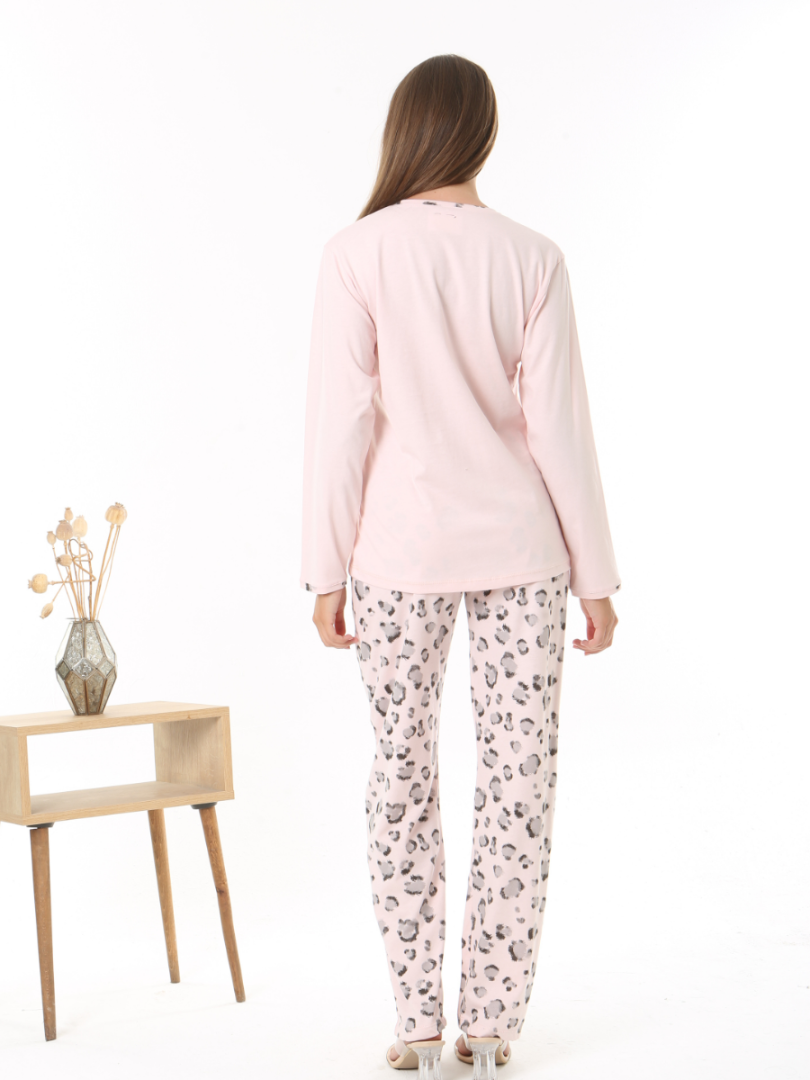 Setul include bluză cu mânecă lungă și pantaloni lungi, ambele decorate cu imprimeu modern tip animal print pe fond roz pal, adăugând un strop de feminitate și stil. Croiala lejeră asigură libertate de mișcare, fiind ideală atât pentru somn, cât și pentru relaxarea de acasă. Elegantă și practică în același timp, această pijama din bumbac este un must-have în garderoba de homewear, garantând confort și un aspect chic chiar și în momentele de odihnă.