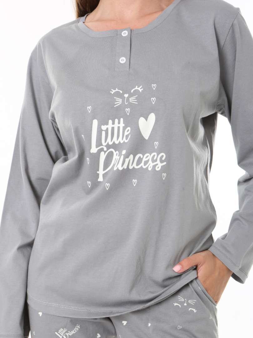 Setul include bluză cu mânecă lungă, croi drept, bordură la decolteu cu trei nasturi și pantaloni lungi, cu un design jucăuș. Se potrivește de minune celor care își doresc nu doar relaxare, ci și un look simpatic acasă. Croiala lejeră asigură libertate de mișcare, fiind ideală atât pentru somn, cât și pentru relaxarea de acasă. Elegantă și practică în același timp, această pijama din bumbac este un must-have în garderoba de homewear, garantând confort și un aspect chic chiar și în momentele de odihnă.