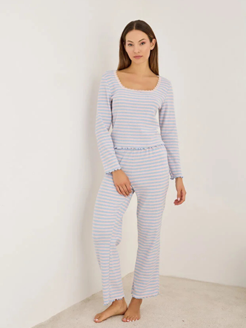 Bluză cu mâneci lungi, cu decolteu patrat. Pantaloni drepti cu elastic în talie. Materialul este este un izolant termic foarte bun și la spălare își păstrează aspectul pe termen îndelungat. Croiala lejeră și finisajele fine fac ca această pijama să fie perfectă pentru relaxare acasă sau pentru un somn odihnitor în nopțile reci. Textura plăcută la atingere protejează pielea și menține căldura naturală a corpului.