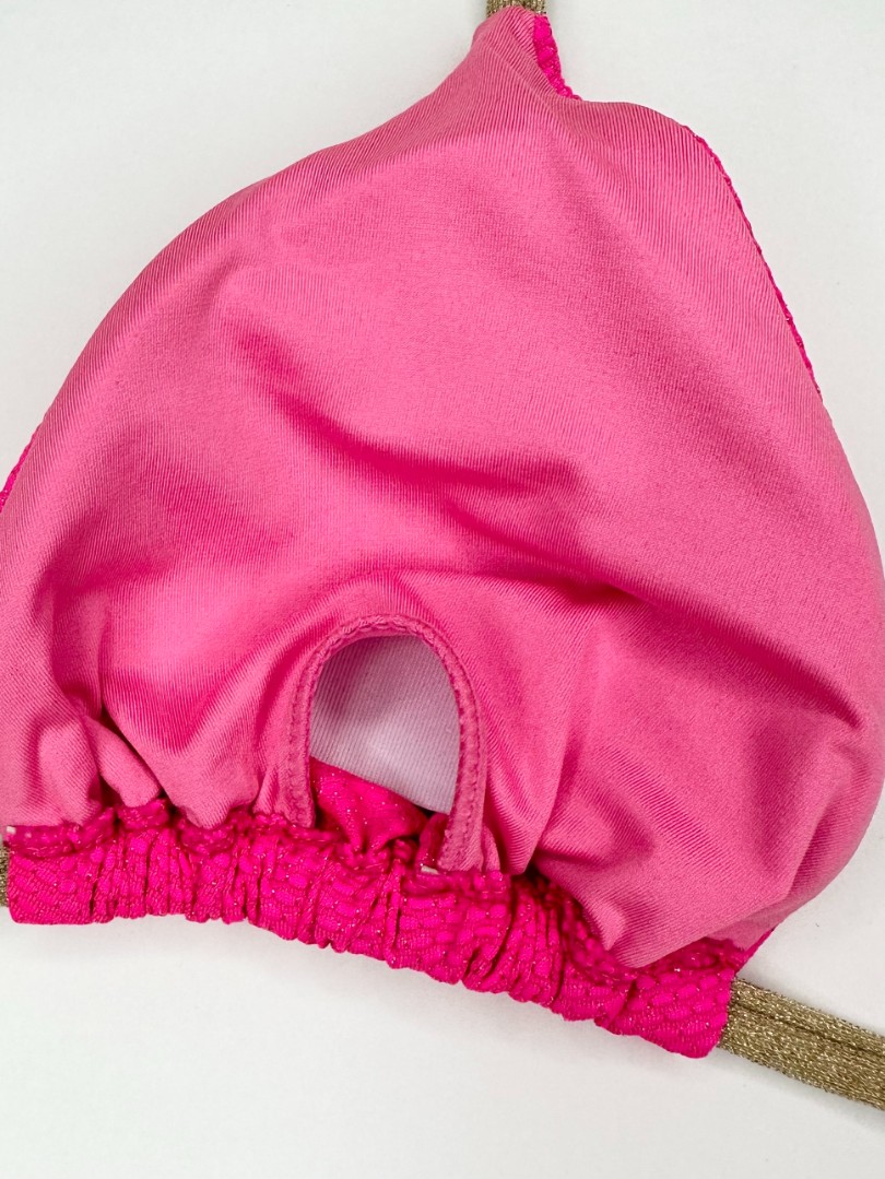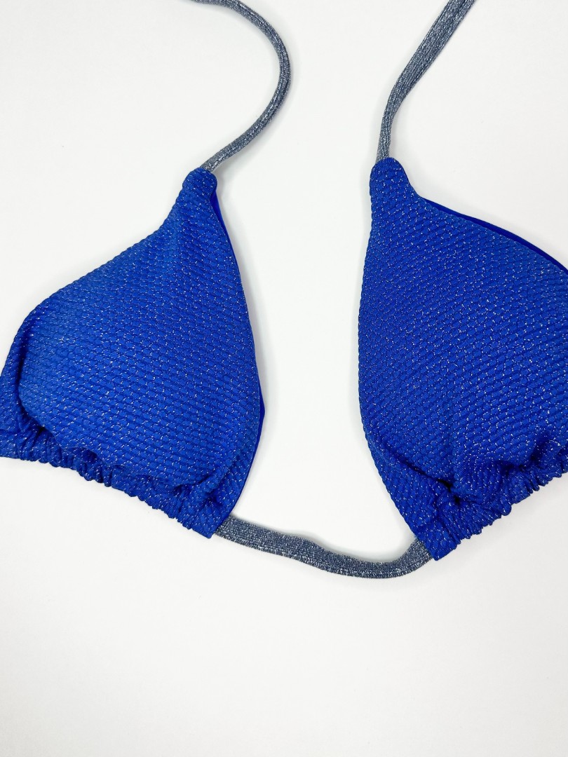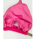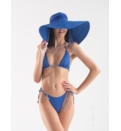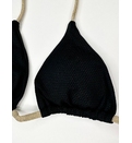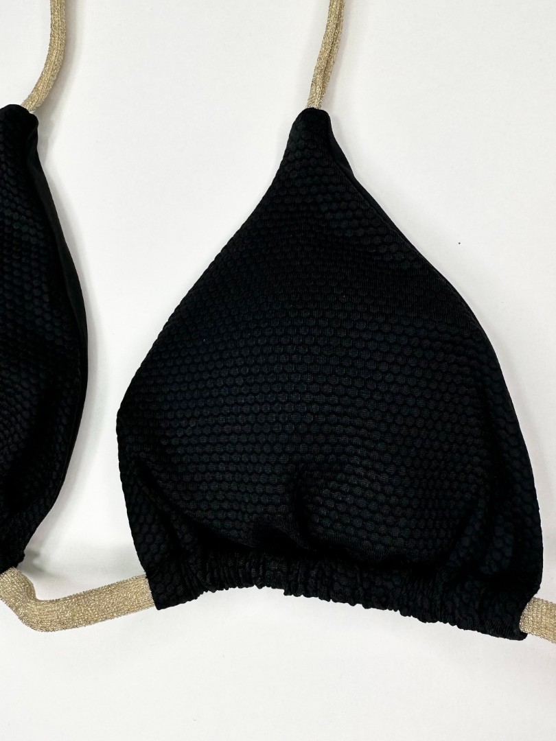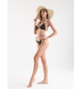 Sutien de baie triunghiular cu dublură, fără armătură, cu bretele subțiri. Cupe căptușite cu inserții detașabile cu legături la spate. Chilot cu legături în laterale, răscroială înaltă în stilul anilor '80. Complet căptușit. Stofă structurată.