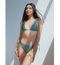 Costum de baie, care adaugă un aer sofisticat, captând lumina într-un mod care îl face să strălucească. Topul este într-un stil clasic de tip triunghi, oferind suport și evidențiind forma bustului într-un mod plăcut. Bretele se leagă delicat, asigurând o ajustare comodă și personalizată. Slip cu talie medie spre înaltă, cu legături în laterale ce permite o ajustare fină.