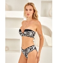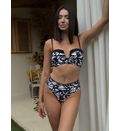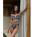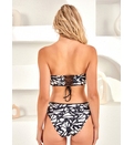 Sutienul este tip bandeau, cu bretele detașabile, cu un decolteu adânc și detalii subtil încrucișate în față pentru un plus de farmec și stil. La spate, sutienul are sistem de prindere reglabil cu șnur, asigurând o potrivire perfectă, adaptată diverselor siluete. Slipul are o croială clasică, confortabilă, cu talie medie și același imprimeu grafic alb-negru ce completează armonios întregul ansamblu. Materialul este plăcut la atingere, rapid uscabil și oferă susținere optimă.