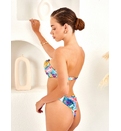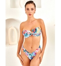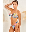 Costum de baie cu top de tip bandeau, cu dublu push up, cu bretele detașabile, care oferă un aspect elegant și confortabil. Textura elegantă accentuează bustul, creând un aspect chic și sofisticat. Imprimeul colorat, cu forme geometrice și nuanțe diverse, nu doar subliniază bronzul, ci și adaugă un strop de veselie întregului ansamblu. Încheietoare de metal la spate. Chiloții brazilieni sunt realizați în stil high-waisted, cu o croială care slăbește iluzia taliei și conturează soldurile. Tăietura îndrăzneață în V subliniază frumusețea siluetei, conferind un aer modern și sexy. Cu încrețitură elegantă la spate, care oferă vizual volum posteriorului. Dublură pe întreaga suprafață.