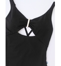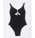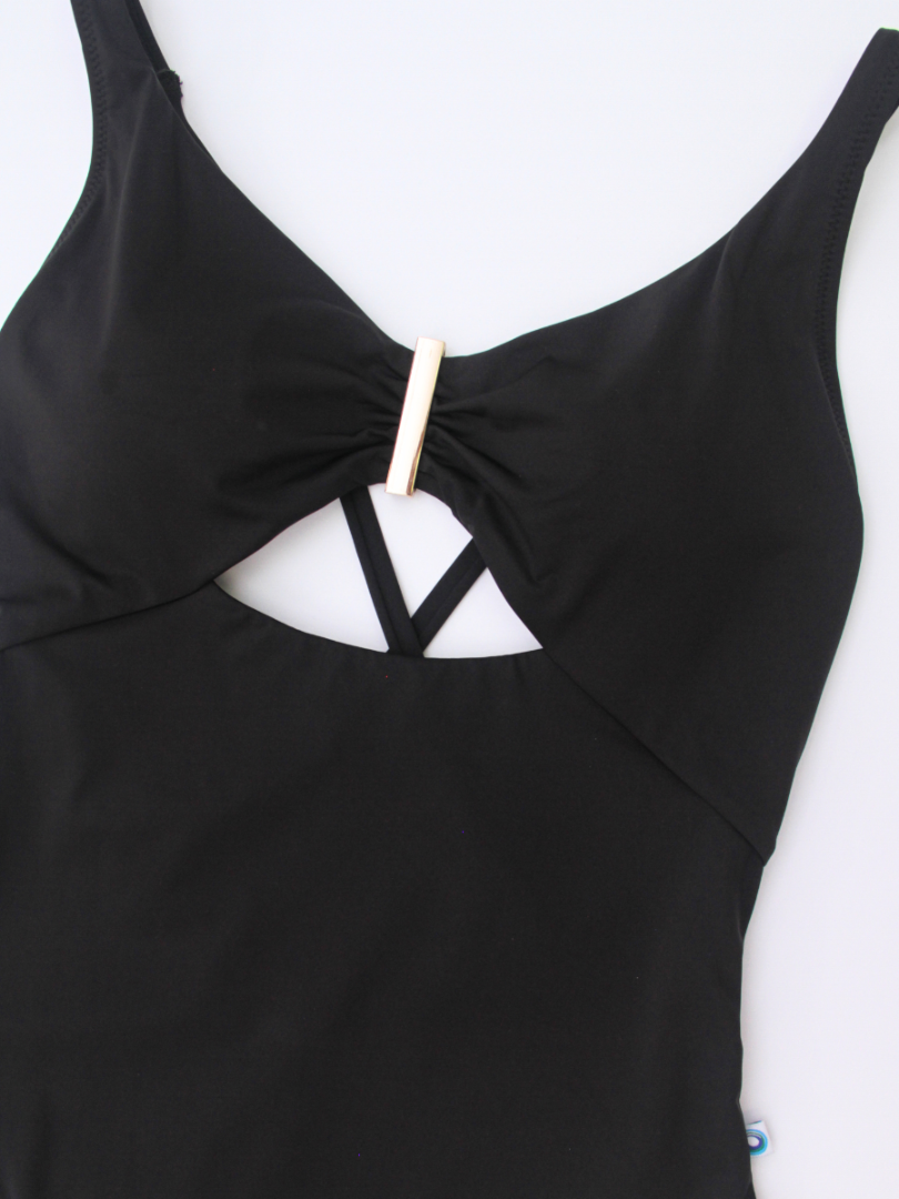 Costumul are un decolteu adânc în formă de V, ce accentuează gâtul și umerii. Detalii precum plisajul din zona centrală și decupajul sub decolteu adaugă un element de originalitate, oferind un aspect modern și atrăgător. Elementul metalic central completează designul, aducând o notă elegantă și minimalistă. Bretelele încrucișate la spate se ajustează și se poate modifica încrucișarea după preferință, asigurând un confort sporit și o potrivire perfectă pe corp. Slipul cu încrețitură la spate oferă volum vizual posteriorului. Dublură pe întreaga suprafață.