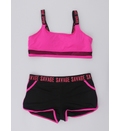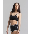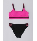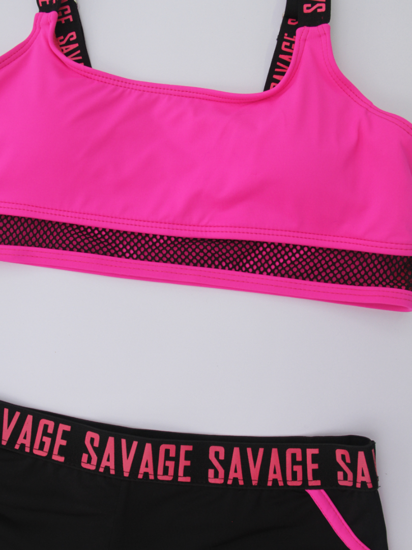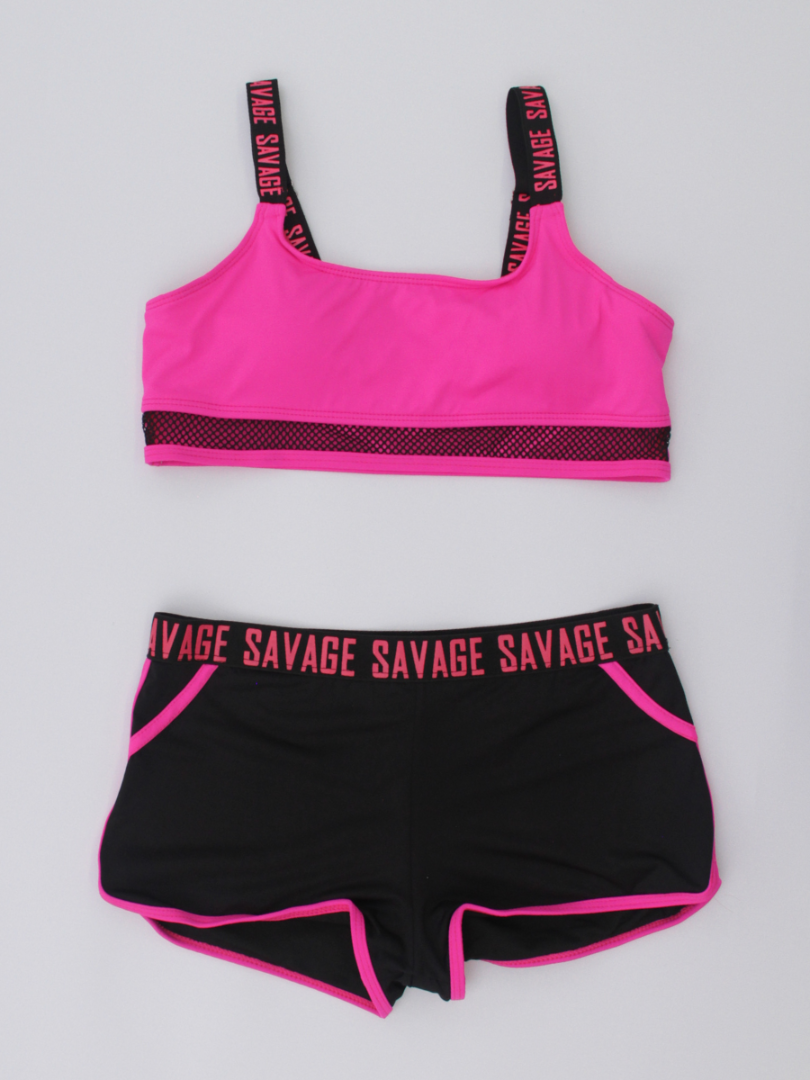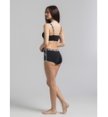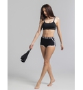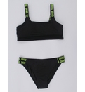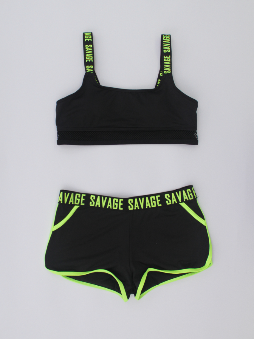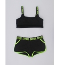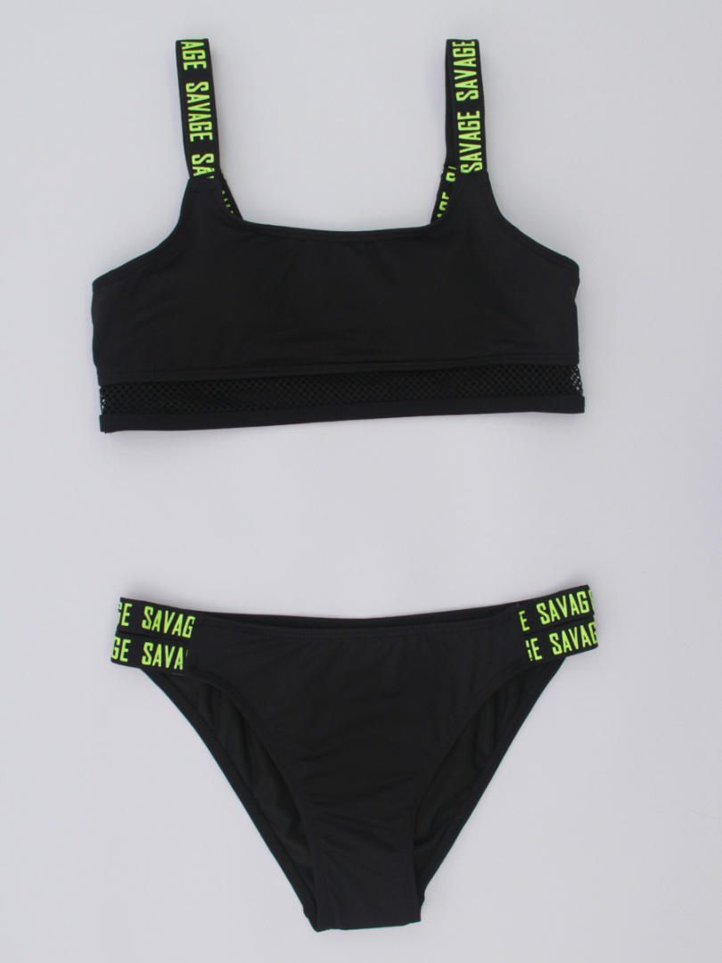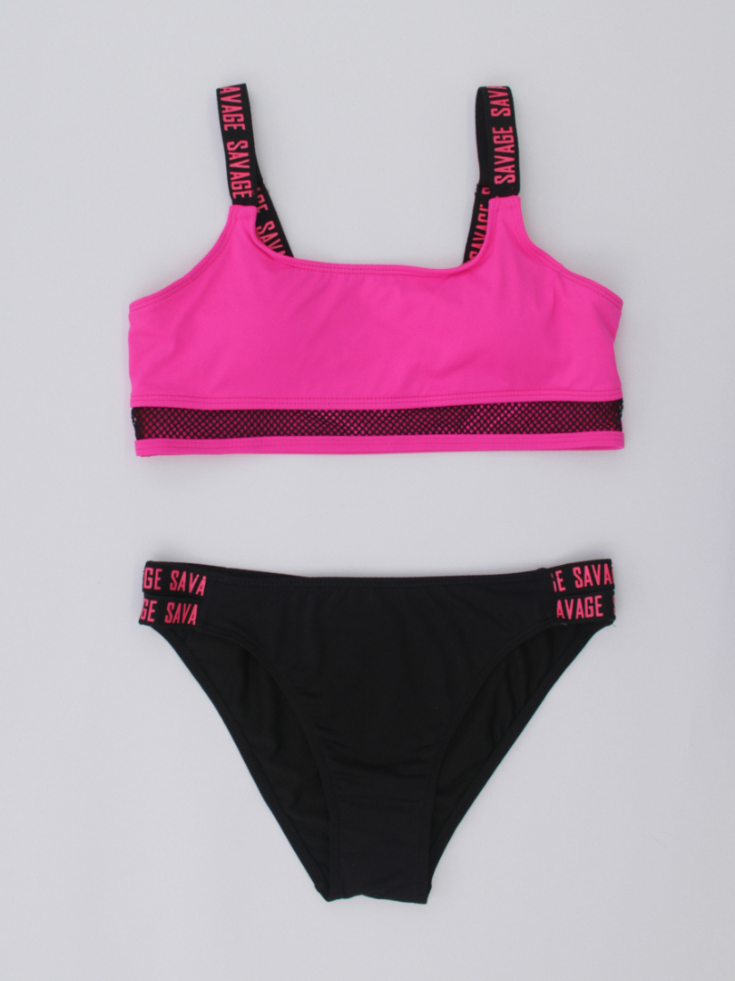 Costumul de baie este de tip sport, compus din trei piese esențiale:Top cu un design modern și sportiv, slipi cu talie medie decupați în laterale și șorturi scurte. Topul de tip crop, realizat dintr-un material elastic și confortabil, cu detalii din plasă, ce adaugă accent. Slipi cu două bretele late laterale, care adaugă un element de stil și stabilitate. Șorturi - ideale pentru un look dinamic, oferind acoperire suplimentară și un aspect sportiv. Croiala lor se potrivește perfect și permite o mișcare liberă.