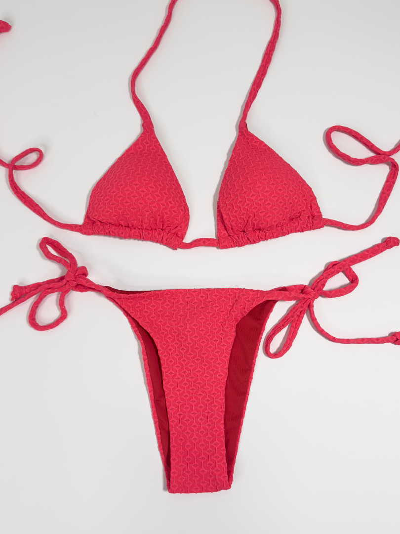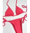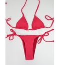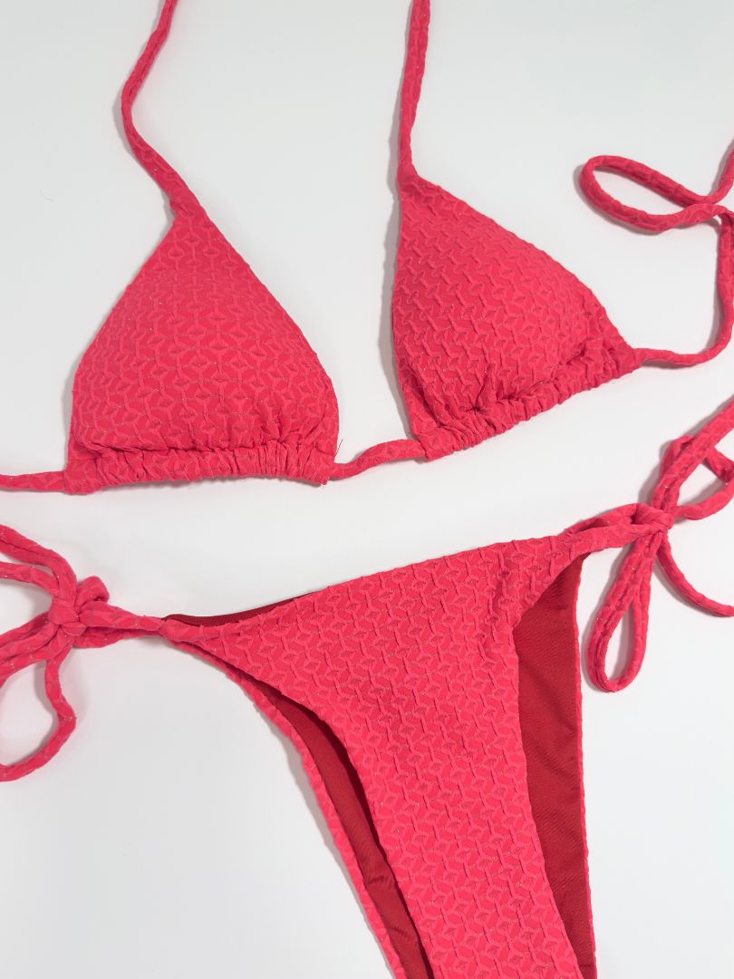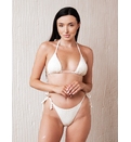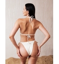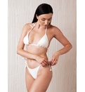 Sutien de baie triunghiular cu dublură, fără armătură, cu bretele subțiri. Cupe căptușite cu inserții detașabile cu legături la spate. Chilot cu legături în laterale. Complet căptușit. Stofă structurată cu fire de lurex.