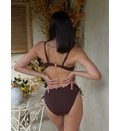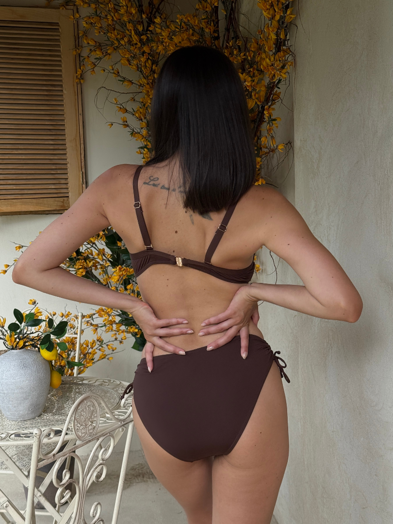 Sutienul fără push up, cu drapaje adaugă un plus de personalitate ținutei tale de vară, în timp ce slipul cu talie înaltă oferă atât confort, cât și o siluetă elegantă. Modelul cu bretele ajustabile și croială stabilă asigură susținere și potrivire perfectă. Se încheie la spate cu încheietoare de metal. Chiloții sunt realizați într-un stil clasic, cu talie înaltă, cu șireturi ajustabile în laterale. Dublură pe întreaga suprafață. Dintr-un material de calitate, acesta asigură confortul pe toată durata zilei.