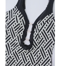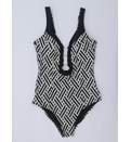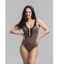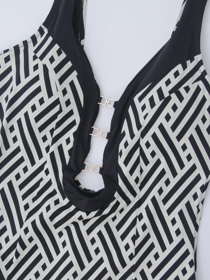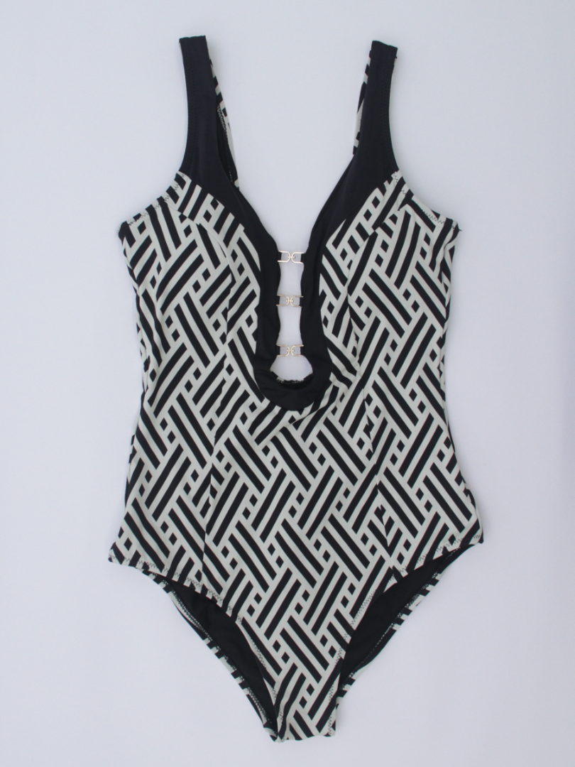Costumul are un decolteu adânc în formă de V, ce accentuează gâtul și umerii. Detalii precum decupajul la decolteu adaugă un element de originalitate, oferind un aspect modern și atrăgător. Elementele metalice centrale completează designul, aducând o notă elegantă și minimalistă. Bretelele late și spatele dezgolit da o notă de senzualitate, dar și confort maxim. Dublură pe întreaga suprafață.