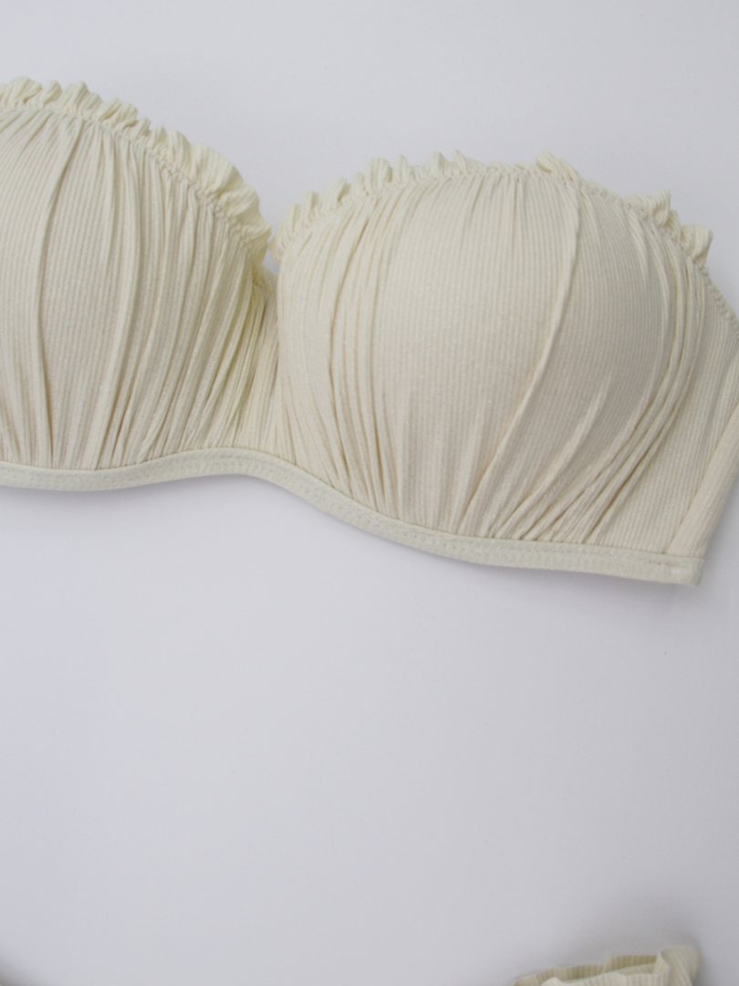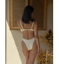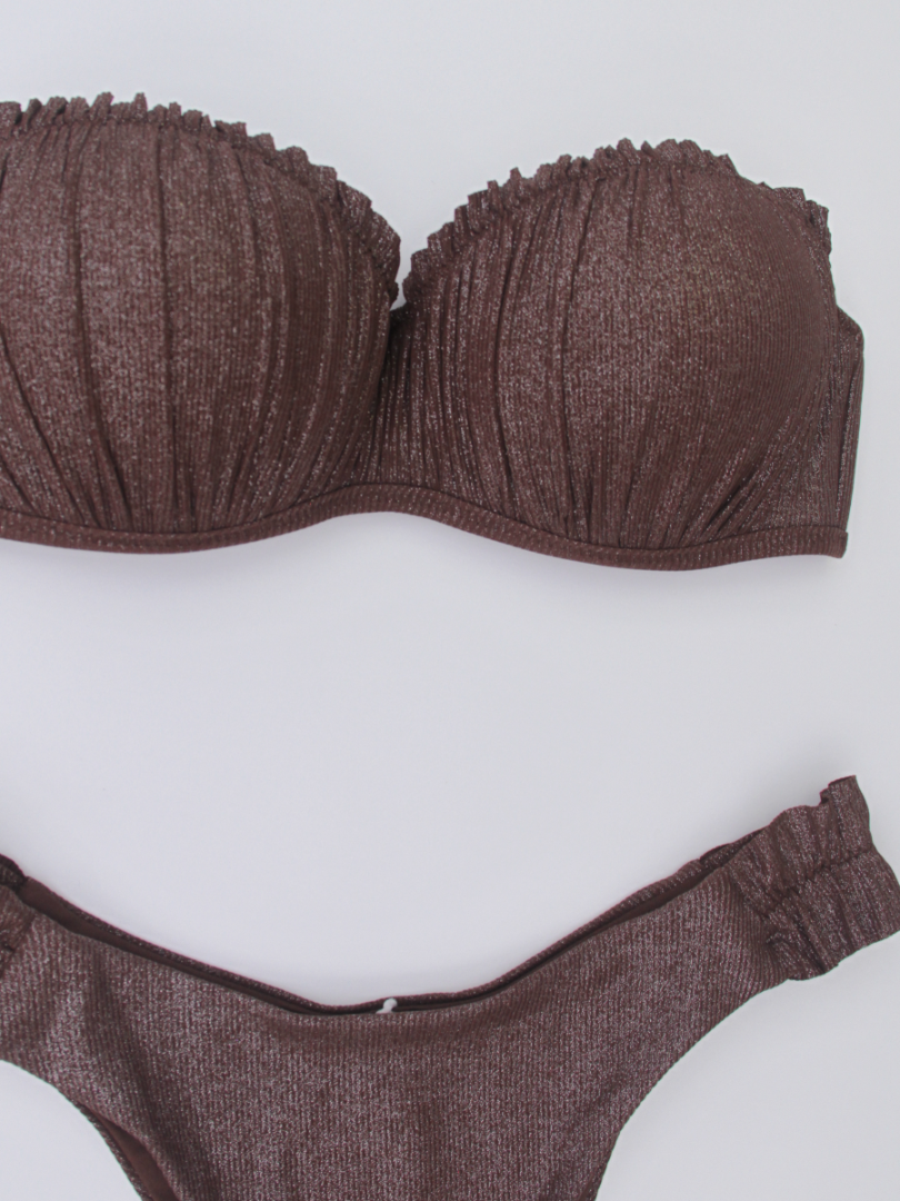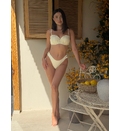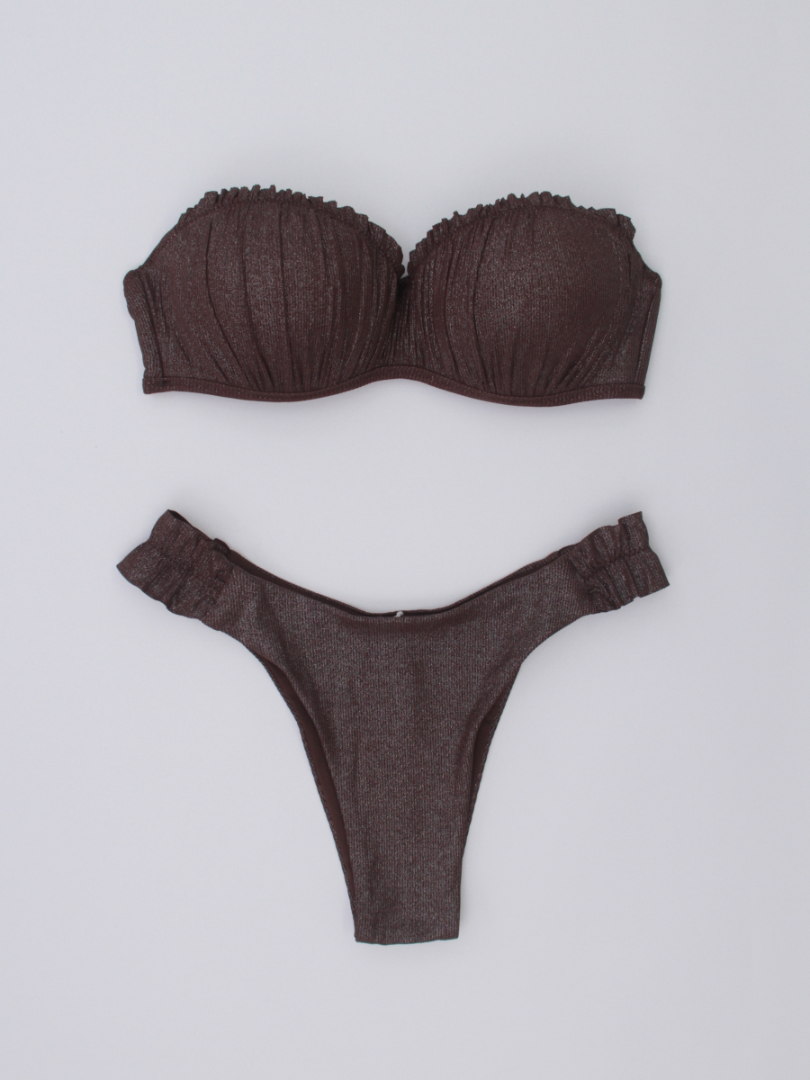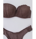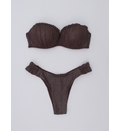 Sutien cu dublu push prevăzut cu un efect de ridicare, oferă un decolteu mai plin și mai bine definit. Stofa cu finisaj strălucitor adaugă un aspect luxos și se simte extrem de plăcut pe piele. Bretele detașabile, ajustabile. Se încheie la spate. Slipii brazilieni cu volănașe în laterale asigură o acoperire minimă și un look sexy, ideal pentru plajă. Dublură pe întreaga suprafață.