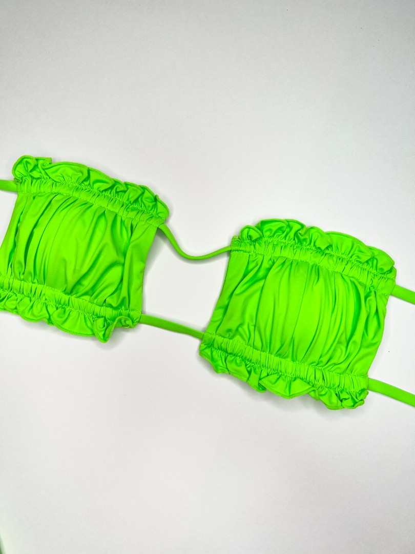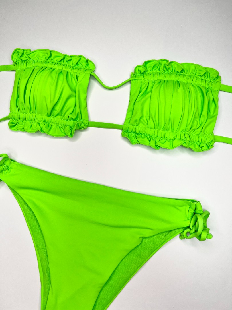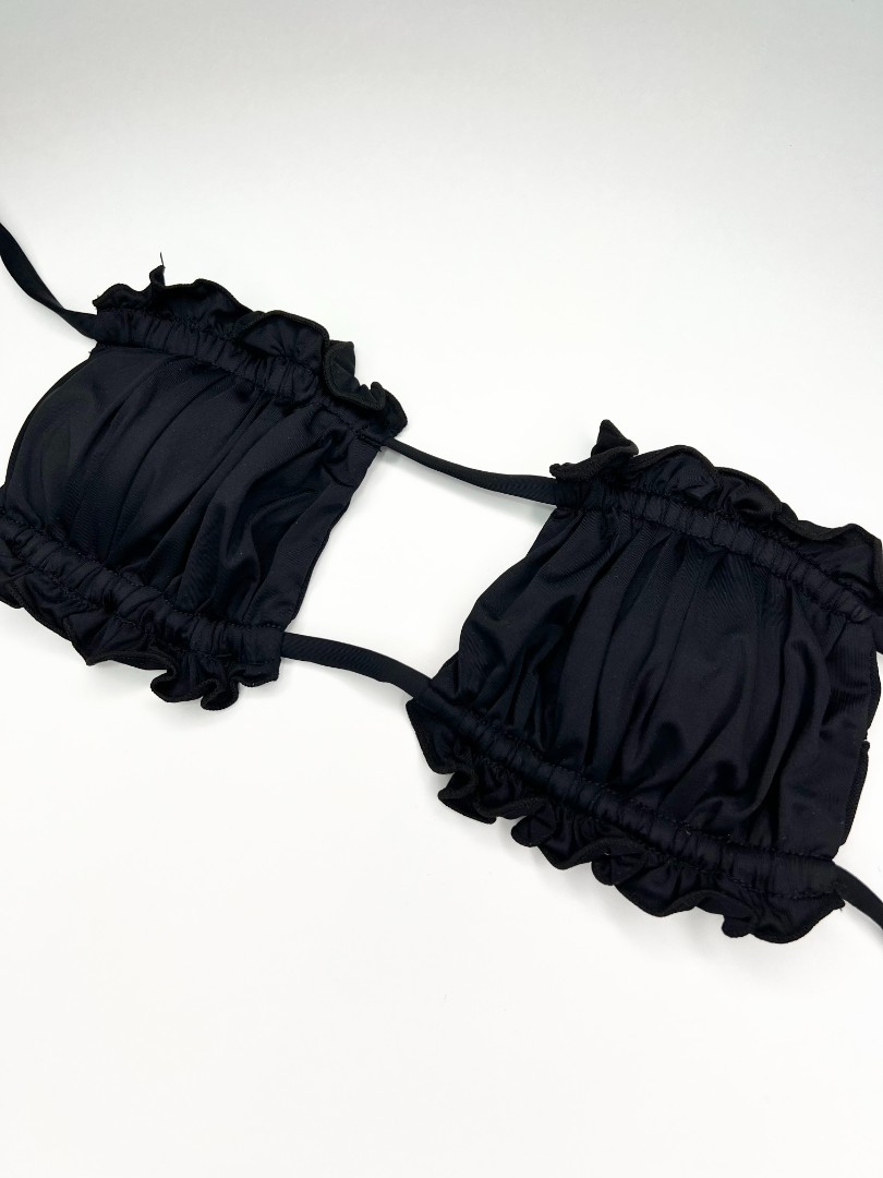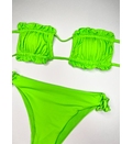 Sutien de baie cu dublură, fără armătură. Cupe căptușite cu inserții detașabile care modelează bustul și asigură o bună susținere, cu legături la spate. Chilot clasic, cu legături în laterale, cu răscroială mai decupată la spate. Complet căptușit.
