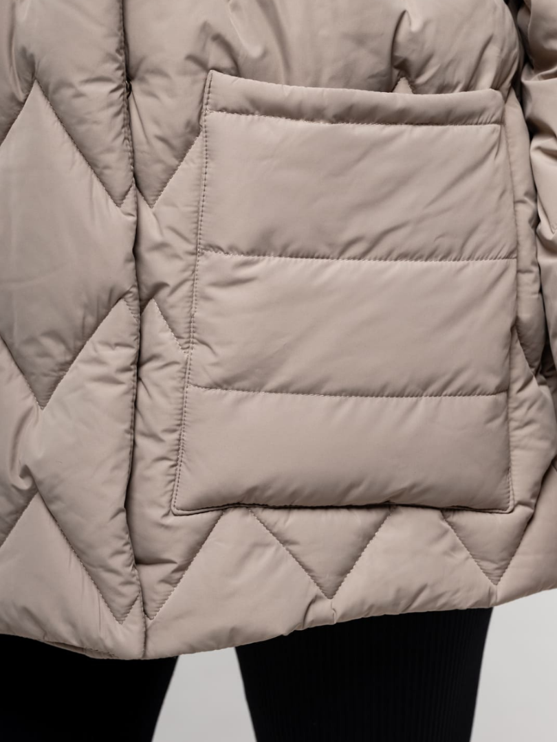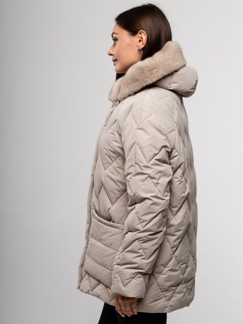 Geaca este dotată cu o glugă mare și confortabilă, care protejează în mod fiabil împotriva frigului și vântului. Gluga este decorată cu blană bogată, ce imită nurca artificială. Acest detaliu nu doar adaugă un plus de lux, dar oferă și căldură suplimentară în zona gâtului și a capului. Buzunarele laterale adânci permit încălzirea mâinilor sau păstrarea obiectelor necesare.