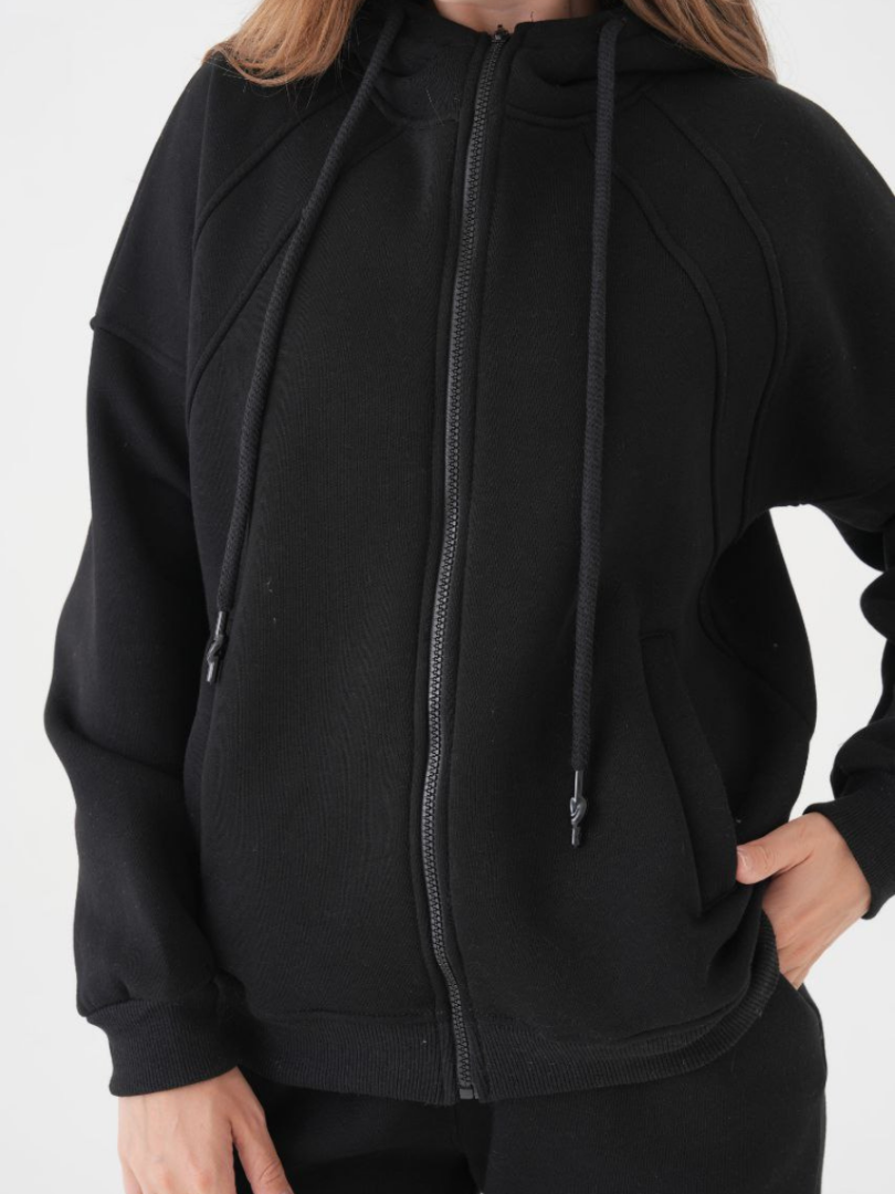 Acest costum sport unisex este alegerea perfectă pentru zilele răcoroase, combinând stilul modern cu confortul absolut. Hanorac cu croială relaxed fit, mâneci lungi, glugă practică și buzunare laterale pentru un plus de stil urban și funcționalitate. Pantaloni de trening cu talie elastică, șnur ajustabil și buzunare, perfect adaptați pentru confort maxim și libertate de mișcare. Fleece la interior – materialul principal, foarte pufos pe partea interioară, menține căldura, fiind ideal pentru sezonul rece sau serile mai răcoroase.