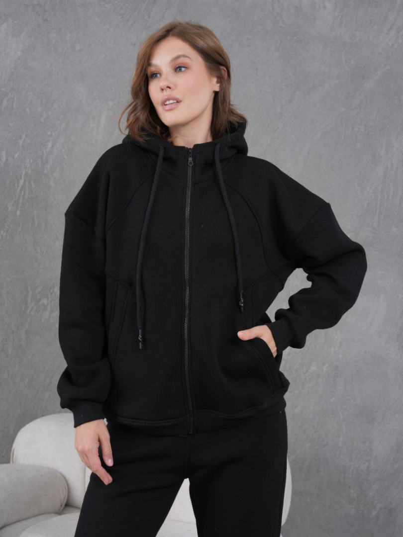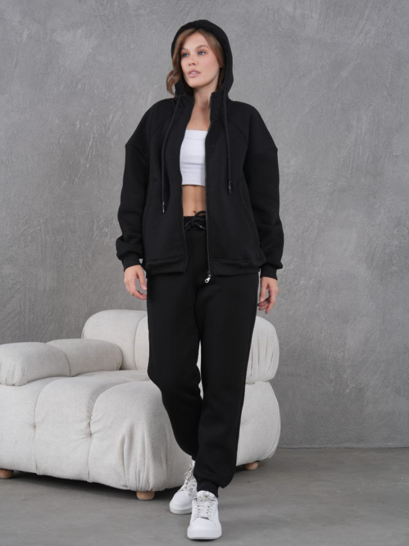 Acest costum sport unisex este alegerea perfectă pentru zilele răcoroase, combinând stilul modern cu confortul absolut. Hanorac cu croială relaxed fit, mâneci lungi, glugă practică și buzunare laterale pentru un plus de stil urban și funcționalitate. Pantaloni de trening cu talie elastică, șnur ajustabil și buzunare, perfect adaptați pentru confort maxim și libertate de mișcare. Fleece la interior – materialul principal, foarte pufos pe partea interioară, menține căldura, fiind ideal pentru sezonul rece sau serile mai răcoroase.